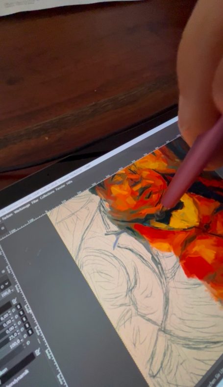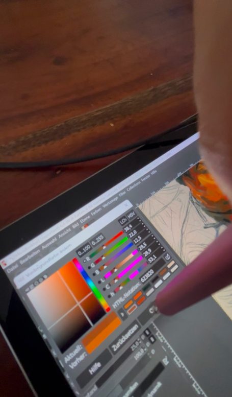Zunächst lege ich auf dem Tablet eine digitale Skizze an. Mit einem speziellen Stift entstehen Linien, Formen und erste Bildideen direkt auf dem Display. Diese Skizze wird anschließend ausgearbeitet: Konturen werden präzisiert, Farben aufgebaut und Licht- und Schattenbereiche ausgearbeitet. Dabei können einzelne Bildelemente jederzeit korrigiert, verschoben oder verfeinert werden, ohne das Werk neu beginnen zu müssen.